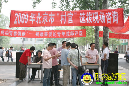 5月7日上午,又在学生区举行了2009年北京市“村官”选拔现场咨询活动。宣传活动持续近两个小时,前来咨询的同学络绎不绝,大家主要对“村官”的政策、服务项目、工作内容及其待遇进行了咨询和了解,现场工作人员给予了耐心、详细、全面的解答。咨询活动共发放宣传单200余份,解答相关问题近百人次,为“村官”报名工作的开展起到了积极的促进作用。在咨询过程中,毕业生普遍比较关注今年“村官”政策中一些较大的调整,对往届“村官”的发展情况也很感兴趣。
