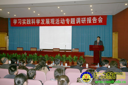 4月14日下午,我校学习实践科学发展观活动专题调研报告会在国际交流中心报告厅举行。教育部部属高校深入学习实践科学发展观活动指导检查第二工作组副组长、江南大学原校长陶文沂,工作组联络员、教育部政法司办公室副主任王家勤,工作组成员、首都师范大学外国语学院党委副书记常建勇出席报告会。我校党委书记、校深入学习实践科学发展观活动领导小组组长杨仁树主持报告会,校长乔建永出席听取报告,副校长孙继平、范迅、姜耀东、王忠强,校党委副书记朱书全对各自负责的重点调研课题进行了专题汇报。