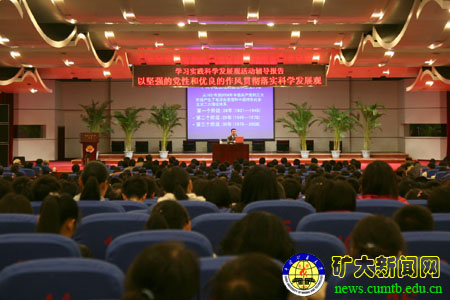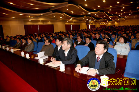 3月31日下午,科技会堂报告厅座无虚席,大屏幕上“实事求是”四个遒劲的大字引人注意,我校学习实践科学发展观活动第二场专题辅导报告会在此举行,中共中央党校党建专家张荣臣教授应邀为我校作题为《以坚强的党性和优良的作风贯彻落实科学发展观》的报告。学校党政领导杨仁树、乔建永、孙继平、范迅、姜耀东、王忠强、朱书全,全校副处级以上干部,教职工党员,离退休人员代表,民主党派及无党派人士代表与学生党员代表共1000多人参加了报告会。校党委书记、校深入学习实践科学发展观活动领导小组组长杨仁树主持报告会。