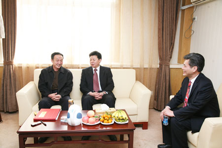 校党委书记杨仁树、党委副书记朱书全与许振超交谈
