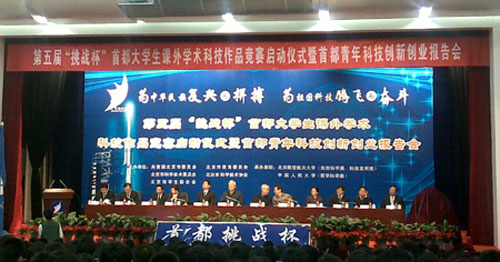 为组织高水平作品参加全国第十一届“挑战杯”大学生课外学术作品竞赛,3月15日,第五届“挑战杯”首都大学生课外学术科技作品竞赛在北京航空航天大学学术交流厅全面启动。中国工程院院士、国家最高科学技术奖获得者王忠诚和中国工程院院士、神舟号飞船总设计师戚发轫应邀出席了启动大会并被聘请为此次“挑战杯”的名誉顾问。我校学生代表和相关负责人参加了启动仪式。