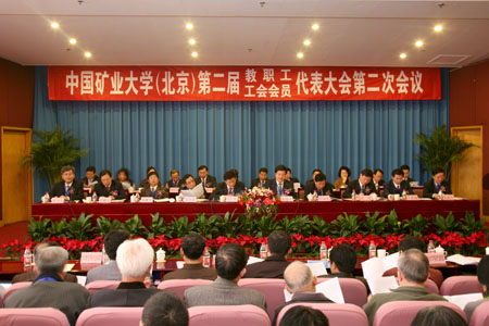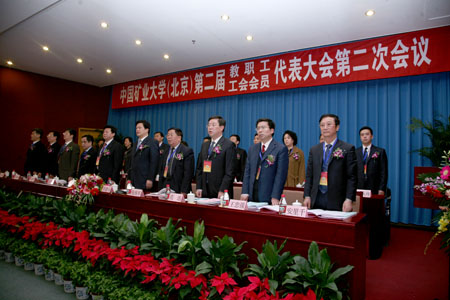 下午2:30,在雄壮的国歌声中,我校第二届教职工暨工会会员代表大会第二次会议在国际交流中心报告厅隆重开幕。校党委书记杨仁树,校长乔建永,原校党委书记张保军,中国工程院院士彭苏萍,副校长孙继平、范迅、姜耀东、王忠强,校党委副书记朱书全,原副校长安里千和大会开幕式主席团其他成员在主席台就座。98名正式代表和特邀代表、列席代表近200人参加了大会。
