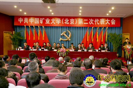 初春的北京,阳光青睐大地;节日的校园,红色涌动激情。国际交流中心报告厅,气氛隆重热烈。主席台上方悬挂着“中共中国矿业大学(北京)第二次代表大会”的会标,主席台后,十面红旗分列左右,簇拥着中间巨大的金色党徽。主席台周边,鲜花绿植装扮,生机盎然。会场内悬挂着横幅:“贯彻落实科学发展观,努力建设多科性研究型开放式高水平大学”。