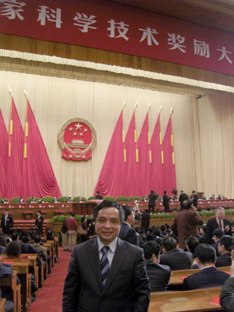 1月9日上午,中共中央、国务院在北京隆重举行国家科学技术奖励大会。党和国家领导人胡锦涛、温家宝、李长春、习近平、李克强出席大会并为获奖代表颁奖。温家宝代表党中央、国务院在大会上讲话。李克强主持大会。