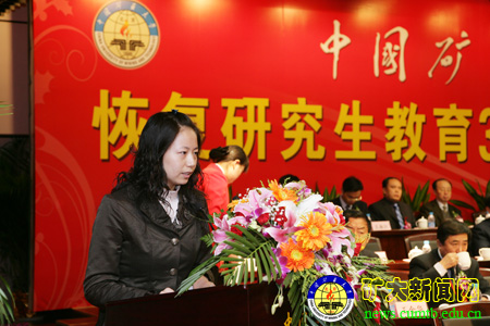 文法学院研究生张娟代表全校同学,向学校恢复研究生教育30周年致以最诚挚的祝贺,表示要努力使矿大在新时代里厚积薄发,开拓进取。
