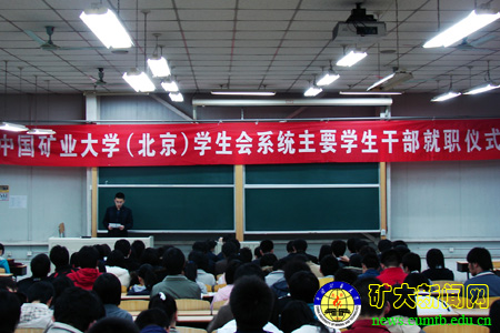 仪式上,校学生会秘书长苏欢老师宣读了《关于中国矿业大学(北京)学生会调整的批复》以及2008-2009年度校学生委员会委员、校学生委员会常务委员会、校学生会主席团、各副主席单位负责人、各委员单位主席以及校学生会部长等学生会系统主要学生干部名单,并颁发聘书。