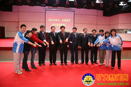 杨仁树指出,我校正处于改革与发展的关键时期,今年11月18日,学校将隆重举行“恢复研究生教育三十周年暨首届董事会成立”庆祝活动;明年3月,将召开第二次党代会;明年10月,将举办百年校庆。他希望全校师生员工,在今后的学习工作生活中,要努力学习、积极实践和大力弘扬北京奥运会、残奥会培育的崇高精神,大力弘扬为国争光的爱国精神,以增强爱校情怀促进爱国精神的塑造,坚定走中国特色社会主义道路的信念,更加自觉地肩负起科教兴国、人才强国、全面建设小康社会的历史使命;要大力弘扬艰苦奋斗的奉献精神,进一步弘扬我校“艰苦奋斗的创业精神和迎难而上的拼搏精神”,勤奋、求实、进取、奉献,扎实做好每一项工作,为学校发展做出更大贡献;要大力弘扬精益求精的敬业精神,坚持以提高办学质量为主线,立足本职岗位,确立更高的学习、工作标准,在人生道路上永远自强不息,永远追求卓越;要大力弘扬勇攀高峰的创新精神,进一步解放思想,大力推进教学、科研、管理、后勤服务等各项体制机制的改革和创新,大力开展科学研究和学术创新,努力探索高水平大学建设之路;要大力弘扬团结协作的团队精神,坚持以人为本,加强集体主义教育,加强学生班集体和教职工基层集体的建设,不断化解各种矛盾,调动一切积极因素,努力构建和谐校园,促进社会主义和谐社会建设;要继承和发扬我校良好的体育运动传统,进一步弘扬奥林匹克精神,促进学生全面发展,全面推进我校体育运动的发展,把我校的体育教学、群众性体育工作和高水平运动队建设提高到新的水平,大力营造体育锻炼的浓厚氛围;他强调,要把学习奥运精神与自身的学习、工作结合起来,与各单位、各部门的改革发展结合起来,与学校“达标创优”工作结合起来,与创建多科性、研究型、开放式、高水平大学的事业结合起来,与建设中国特色社会主义的伟大实践结合起来,创造出无愧于时代的业绩。要以北京奥运会、残奥会成功举办为契机,大力发扬奥运精神,更加紧密地团结起来,坚定信心、锐意进取,埋头苦干,为早日实现多科性、研究型、开放式高水平大学的办学目标而努力奋斗。