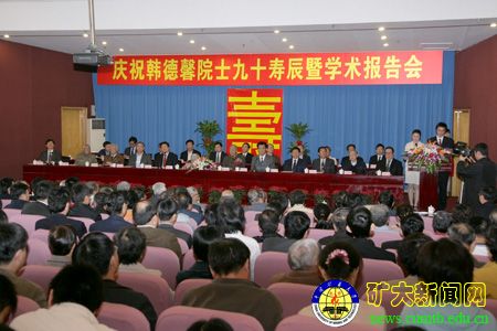 上午10点30分,庆祝活动正式开始。当九十高龄的韩德馨院士步入会场时,现场响起了经久不息的热烈掌声。大家在用掌声表达着对这位为我国煤田地质事业奋斗了66年的老人的崇敬与祝福。出席韩德馨院士庆祝活动并在主席台就座的领导和嘉宾有,国家煤矿安全监察局副局长王树鹤,我校校长乔建永、校党委书记杨仁树,中国煤炭工业协会副会长孙之鹏,中国矿业联合会副会长崔德文,中国科学院院士陈梦熊、宋振骐,中国工程院院士鲜学福、张铁岗,安徽煤田地质局局长李学文,华北科技学院院长杨庚宇,中国煤炭学会副秘书长岳燕京,中国地质学会副秘书长郝梓国,中国煤炭工业协会人事培训部主任王虹桥,中国煤田地质总局副局长孙升林,中国矿业大学副校长秦勇,太原理工大学副校长郭敏泰,西安科技大学副校长张金锁,河南理工大学副校长周英,河北工程大学副校长孙玉壮,华北科技学院副院长徐志斌。来自全国相关煤炭企事业单位的领导、嘉宾,韩德馨院士的好友、同事、弟子以及我校有关部门负责人,资源与安全工程学院部分师生代表200多人参加了庆祝活动。