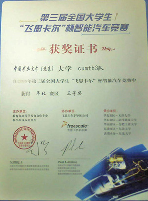 我校学生荣获第三届“飞思卡尔”杯智能车大赛华北赛区三等奖