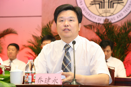 校长乔建永教授在典礼上发表了热情洋溢的讲话。他首先对研究生表示衷心的祝贺和热烈的欢迎,并简要介绍了学校的办学历史、教育教学、师资队伍、学科建设、基础设施等基本情况。他指出,近年来,学校积极构建开放式研究生教育体系,把培养和造就高素质创新人才作为学校的根本任务,不断提高研究生的培养质量,办学水平显著提高,为我校高水平的研究生教育和广大新同学提供了优越的科研环境和条件。