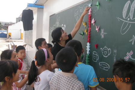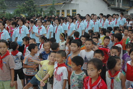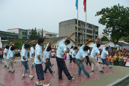 这所小学共有6个年级,18个教学班,学生共1000余人,在地震中校舍损毁严重,所有的教学楼和办公楼都成为危房。两座危楼在灾后被推平,在大连援建队的帮助下,在原址建起了活动板房。第七批志愿者中的我校学生在到达驻地后,积极参与到学校校园重建工作之中。我校学生不怕苦、不怕累,积极参与安置教室、拉网通电、搬运物资、安装电扇等苦活累活。学校复课后,第八批志愿者中的我校师生在前一批志愿者工作的基础上,不仅教授英语、音乐、美术、体育、朗诵与表演、心理健康教育等课程,还增加了折纸、表演、趣味数学等,展现了我们“趣味教学,快乐教学”的理念。为了让孩子们在有限的时间空间锻炼身体,丰富课间生活,服务团编排了一套适合儿童锻炼身体的健身操,我校学生便在值班的早晨带领孩子们一同练习。8月4日,是一个令服务团全体志愿者难忘的日子。早上,服务团全体成员在学校的一块空地中与1000余名学生一起参加了升旗仪式。在满目疮痍的校园空地,唱着国歌,看着鲜艳的五星红旗,令每一个人都为之动容。