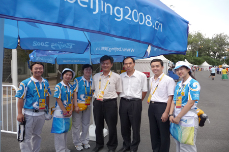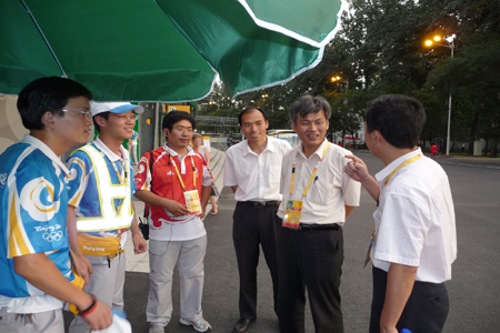 8月16日,我校奥运会志愿者工作领导小组副组长、校党委副书记朱书全教授,在校学生工作处处长乔红兵,校奥运会志愿者工作领导小组办公室主任、校团委书记杨庆舟陪同下到北京工人体育场慰问我校工体赛会志愿者。