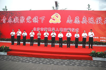 在纪念中国共产党成立87周年、北京奥运会倒计时39天之际,6月30日上午,由北京市委组织部、团市委主办的“青春凝聚党旗下 志愿奥运做先锋”北京市新党员入党宣誓活动在奥林匹克公园公共区志愿者广场举行。中共中央政治局委员、北京市委书记、北京奥组委主席刘淇,市委副书记王安顺,市委常委、组织部部长吕锡文,奥组委执行副主席李炳华,团中央书记处书记卢雍政等出席活动。在奥运工作一线及抗震救灾工作中新入党的党员、包括我校100名志愿者党员约1500人参加了活动。