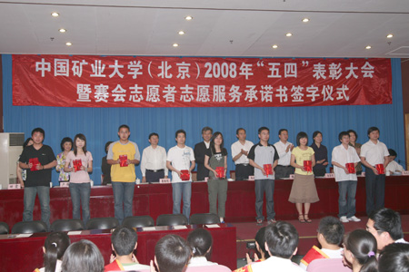 为作好我校2008年“五四”评选表彰工作,校团委与07年12月份下发了《中国矿业大学(北京)基层团委工作考评办法和中国矿业大学(北京)基层团委工作考评标准》的通知(中矿大京团字[2007]28号),从团的思想建设、团的组织建设、大学生学术科技活动、社会实践活动、校园文化活动、学生组织工作六个方面,对我校基层团委自07年5月至08年4月的工作进行量化评比,并根据量化评比的分数作为红旗团委评选的主要依据。08年4月份又下发了《共青团中国矿业大学(北京)委员会关于开展2008年团员教育评议和先进评选工作及推荐优秀团员作党的发展对象工作的通知》(中矿大京团字[2008]5号),按照《中国矿业大学(北京)团学工作先进评选奖励暂行办法》(中矿大京团字[2007]6号)规定的校级先进团支部的评选比例不超过20%,校级优秀团员的评选比例不超过3%,优秀学生团干部的评选比例不超过10%,校级红旗团委评选比例不超过30%,校级红旗团支部不超过15个的具体要求,在各学院团委评选、推报的基础上,经校团委研究,报校党委同意,确定了获得表彰的各类先进集体和个人。