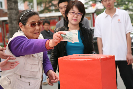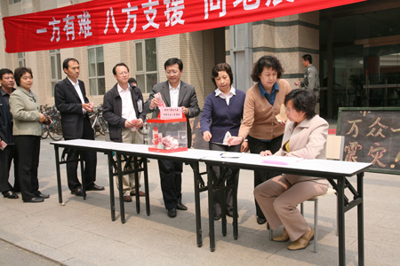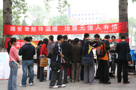 5月14日上午,学校在新图书馆门前设立了捐款点,同时,校学生会、校红十字会也在学生区设立了捐款箱,号召全体师生员工踊跃捐款,为救援灾区人民奉献自己的爱心。在这两个地方,上演着最感人、最动人、最美丽、最真挚的画面。