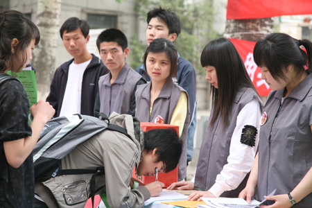 张冬艳和张琳是文法学院06级的两名普通女生,也是学校红十字会的两名工作人员。在学生区捐款点,她们的任务是登记每个捐款人的名字和金额,可是,绝大多数的老师和学生在捐款后扭身就走,不愿意留下姓名。她们对每位熟悉的陌生人都真诚地说声“谢谢”。张冬艳说她也不知道说了多少声谢谢,也许短短两个小时内说的“谢谢”比她之前十几年说的都多。负责登记名字张琳看到一幕幕感人场景后,再也忍耐不住,感动得泪水不时溢满双眼。