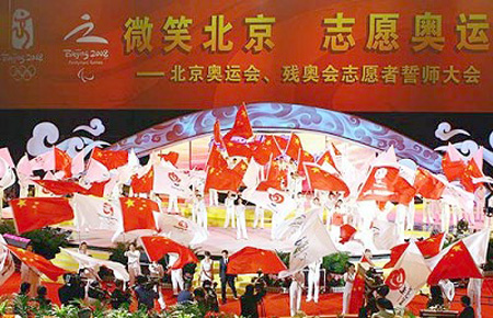 中共中央政治局委员、北京市委书记、北京奥组委主席刘淇为北京奥运会、残奥会志愿服务总团授旗,标志着北京奥运会、残奥会志愿者总团正式成立。