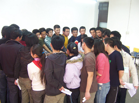 活动共分为四个时段,分别为“相识相知”、“相互扶持”、“相互信任”和“相互祝愿”。首先将学生一一配对进行深入了解,然后三对形成一个小组;第二时段以小组形式进行主题为“我的大学”的“图画接力赛”,每个组员轮流作画,然后对这五幅小组作品进行集体评议;第三时段将学生分批扮演“盲人”和“哑巴”,配对进行“信任之旅”,让他们体验当盲人或者哑巴,以及给予帮助或者接受帮助的感觉。最后一个时段促使个体更加明确生命当中必然存在的缺失,不再抱怨或自怜,更加积极面对人生,在团队中大声说出自己近期的一个成长发展目标,并得到大家的鼓励与祝愿。