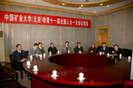 第十一届全国人民代表大会第一次会议3月5日上午在人民大会堂隆重开幕。国务院总理温家宝向大会作了政府工作报告。为认真学习贯彻会议精神,我校党委理论学习中心组在国际交流中心201会议室集中收看了大会盛况,聆听了温总理的政府工作报告。校党委书记张保军,校长乔建永,副校长杨仁树、孙继平,党委副书记范迅,校长助理、研究生院常务副院长姜耀东,校党委常委、党委组织部部长王忠强及党政办公室、党委宣传部负责人等一起观看了大会开幕式。