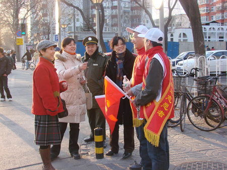 3月2日上午,我校8名奥运会社会志愿者准时到达服务岗位,开始志愿服务工作。动员大学生志愿者参与“两会”期间服务是对北京奥运会社会志愿者工作的一次集中检验,承担着为“两会”胜利召开营造和谐社会氛围的任务。我校与海淀区其他3所高校共同负责全区20个重要区域的灯控路口的交通秩序维护、帮扶助困、问事问路解答等志愿服务工作。