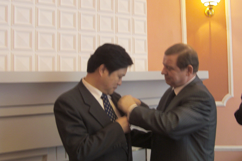 莫斯科大学校长为乔建永校长佩戴纪念章