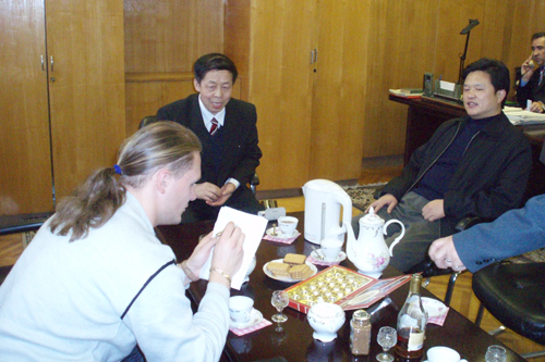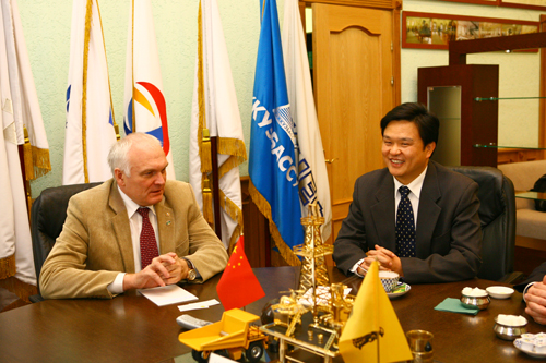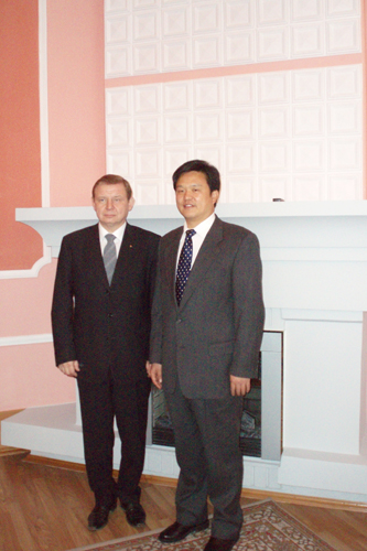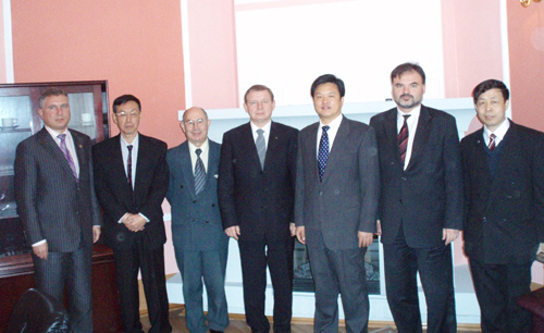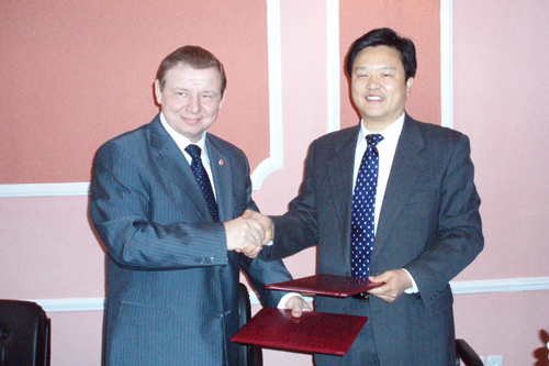 次日早晨,曾到机场迎接代表团的尼古拉副教授亲自驾车接代表团到莫斯科矿业大学。代表团到达学校时,莫斯科矿业大学的科尔查克校长早已等候在那里,随后双方就校际合作协议的框架等进行了协商,为协议的签定奠定了良好的基础。经过几天的磋商修改,代表团返程之日,两校校际合作协议终于定稿,双方就教学、科研合作以及合作的经费、实施方式等达成协议,并于11月19日在莫斯科矿业大学举行了庄重的签字仪式。签约在热烈友好的气氛中进行,两校校长代表各自的学校互换了签字后的协议文本,致词表达了对合作前景充满信心的展望。签约后,俄方向代表团赠送了图书资料。合影留念之际,科尔查克校长将一枚画面为两国国旗的中俄友好年标志性徽章别在了乔建永团长的胸前,美好祝愿尽在不言之中。