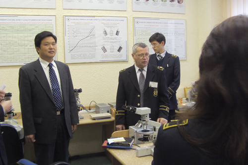 当代表团连夜乘车达到圣彼得堡时,圣彼得堡矿业学院早已派人迎候在车站,一种宾至如归的温暖驱散了北纬60度的冬寒。稍事休息后,代表团便乘车来到学校,校长利特维年科推掉一切事务,抽出充足时间同代表团进行会谈。我校校长乔建永向对方介绍了学校的基本情况、建设成果,并特别介绍了中国关于高水平大学公派研究生计划的具体政策背景,以及我国改革开放取得的巨大成就,引起对方的浓厚兴趣,促进了下一步开展合作交流的共识形成。随后双方互赠了文字资料。代表团参观了该校的地质与矿业博物馆。