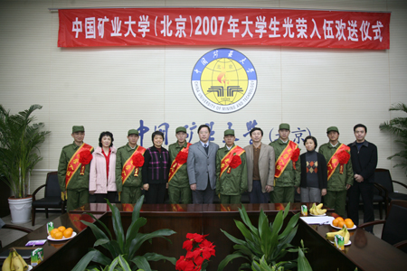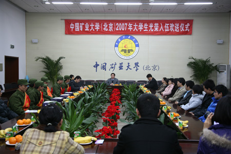 12月10日下午,我校2007年大学生光荣入伍欢送大会在1号办公楼第一会议室举行,热烈欢送今冬应征入伍的6名大学生新兵。校党委副书记范迅出席了会议并讲话。党委武装部、学生工作处、校团委负责人,资源学院、机电学院、力建学院主管学生工作的党总支部书记及校学生会和各学院的学生代表参加了欢送会。