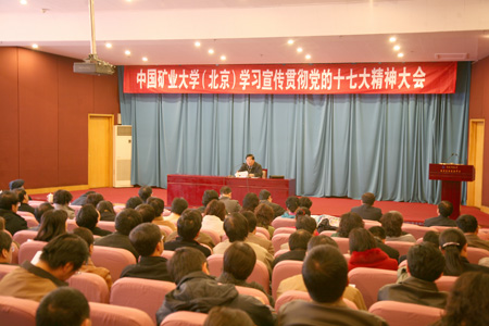 为积极推动全校掀起学习宣传贯彻党的十七大精神高潮,11月13日下午,我校在国际交流中心报告厅召开学习宣传贯彻党的十七大精神大会。校党委书记张保军以《深刻领会大会精神,掀起全校学习宣传贯彻党的十七大精神高潮》为题作十七大辅导报告,并部署学习宣传贯彻工作。全校各教职工党支部书记、科级以上干部和副高职称以上人员共200多人参加了会议。这次会议既是一次学习辅导会议,也是一次动员和部署会议,标志着我校深入学习宣传贯彻党的十七精神工作正式启动。