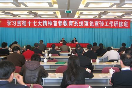 为深入学习宣传贯彻党的十七大精神,10月30-31日,北京市委教育工委、市教委举办了首期“首都教育系统学习贯彻十七大精神理论宣传工作研修班”。来自首都各高校、市教委直属直管单位和各区县教育主管部门的领导共70多人参加了研修班。我校党委书记张保军参加了研修班,并作为召集人主持了小组讨论交流活动。
