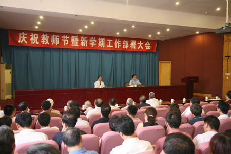 乔建永指出,8月31日,胡锦涛总书记亲切接见了全国优秀教师代表,与大家座谈并发表了重要讲话,这是送给全国教师最好的节日礼物,令大家倍感振奋。胡锦涛在讲话中向全体教师提出的“四点希望”是对新时期师德精神的新阐述、新概括,也为教师提高师德素养指明了努力方向。全校教师一定要认真学习,深刻领会,做好贯彻落实工作。要强化角色意识,增强使命感和责任感,学为人师,行为世范,全身心地投入教育教学工作。要爱岗敬业、关爱学生,以真情、真心、真诚教育学生,以高尚人格教育和影响学生,成为大学生健康成长的指导者和引路人;要刻苦钻研,严谨治学,恪守学术道德,发扬优良学风,不断提高教学质量和教书育人的本领;要勇于创新,奋发进取,更新教育观念,改进教学方法,努力培养具有创新精神和实践能力的一代新人;要淡泊名利,志存高远,不断加强师德修养,甘为人梯,乐于奉献,努力做受学生爱戴、让人民满意的教师。要进一步增强爱校情怀,关心集体,以校为家,积极努力,继续为学校的建设和发展做出应有的贡献。