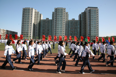 伴随着欢快的运动员进行曲,国旗手、裁判员、运动员队伍依次入场,接受学校领导的检阅。嘹亮的口号、整齐的步伐、蓬勃的风貌、昂扬的斗志,展现了我校师生员工的良好精神风貌,赢得了主席台和看台上师生的阵阵热烈掌声。