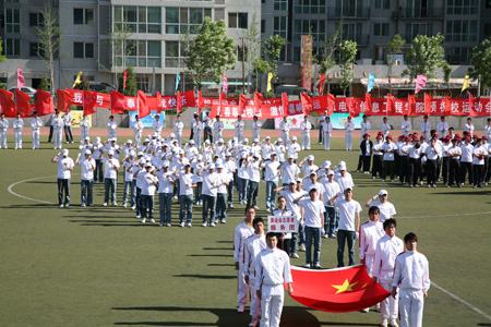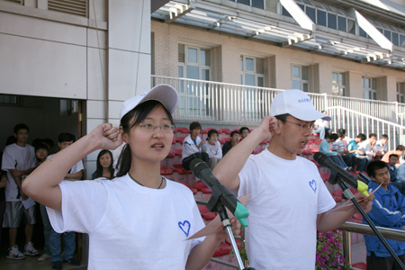 宣誓仪式上,我校2000多名奥运志愿者举起右手,在领誓人的带领下,用整齐的声音庄严宣誓,“作为首都高校系统的光荣成员,我们肩负着传承人类文明的使命,我们应当成为社会道德的楷模。在奥运会即将在首都举办之际,在我们向全人类展示中华文明的神圣时刻,我们将以实际行动向全社会证明,我们是社会和谐的先锋,我们是社会文明的示范。在此,我们庄严承诺:迎接奥运从讲文明做起,参与奥运从身边做起,奉献奥运从现在做起!迎奥运,讲文明,树新风;我参与,我奉献,我快乐。”庄重而严肃的宣誓,表明了我校大学生做和谐先锋、做文明示范的决心和信心。