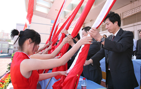 仪式上,校领导还向学校奥运志愿者服务总团和各学院奥运志愿服务分团授了旗。