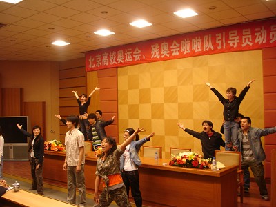 会议还对啦啦队引导员进行了思维拓展训练,高校奥运志愿者工作8个项目群的啦啦队引导员展示了自己新颖的加油助威方式,我校所在的北京大学项目群的展示获得了好评。