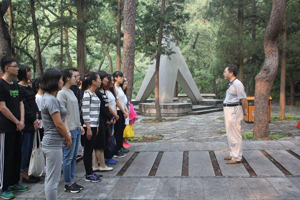 本网讯9月24日清晨六点半,天空早已放亮,文法学院2016级新生一起乘车来到北京植物园。今天的北京没有了夏日的燥热,也没有冬日的冷寂,只有晴朗的天空和微风带来的阵阵凉意。8点半左右,老师同学们开始了植物园的游览,从东南门进入,先后经过了万生苑、和平月季园、热带植物展览温室等地,并在许多地方合影留念;最终穿过大半个植物园来到了一条曲曲折折的小路上。在小路的尽头,一座三角形的石碑巍然耸立,这正是新生今天来这的目的:看看那些“同龄人”,看看那些为国家民族献身的英雄们。