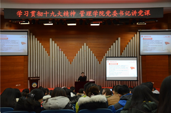 本网讯 为及时准确把握党的十九大精神,勉励学生党员不忘初心,牢记使命,不断提振精神状态,改进学生工作,12月12日下午,管理学院于民族楼407成功开展了“学习贯彻十九大精神,管理学院党委书记讲党课”活动。管理学生党委书记杨庆舟主讲,党委秘书、学生工作办公室主任崔艳娜主持,团委书记李烁玮,本科生辅导员鲁金华出席,管理学院全体学生党员、预备党员、2017年第2期入党积极分子300余人参与学习。