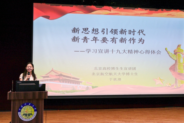 宣讲团副团长、中央财经大学博士生曾懿亮以《现代金融体制改革构建现代化经济体制》为题,以经济学角度从现在、过去和未来多层次分析十九大报告,对我国的经济发展走势进行了详细的阐述和说明;宣讲团副团长、中国矿业大学(北京)硕士生李宜阳以《从<习近平的七年知青岁月>中寻找“初心”》为题,结合《梁家河走出的少年》,总结青年人从习近平身上应学习到矢志不渝的理想追求、勤奋好学的进取精神和艰苦奋斗的优秀品质;宣讲团副团长、北京航空航天大学博士生于秋漫以《新思想引领新时代,新青年要有新作为》为题,从十九大报告概述、五年来的成就和历史性变革、中国特色社会主义进入新时代、社会主要矛盾的变化和习近平新时代中国特色社会主义思想五个方面进行了阐述;宣讲团成员、外交学院徐彤宇以《成德明知,笃行报国》为题,围绕使命、格局、品格和实际问题四个方面讲述如何将理论与实践相结合为国家发展做出自己的贡献;宣讲团成员、北京邮电大学硕士生蔡蓉珽以《现代化大国梦在四方,新时代青年不忘初心》为题,从世界、国家及自身的角度宣讲了新时代的格局、中国梦和世界梦的对接、“两个一百年”奋斗目标,带领同学们深入学习了习近平新时代中国特色社会主义思想、十九大报告和习近平总书记“5•2”重要讲话精神。