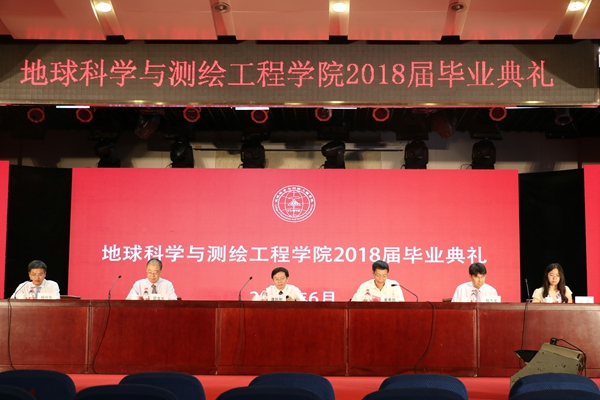 本网讯 6月23日上午,地球科学与测绘工程学院2018届毕业典礼在科技会堂报告厅举行。学院学位委员会主任、院长唐跃刚,学院学位委员会委员、副院长邵龙义、程久龙、李晶,党委副书记杨向东出席典礼。此外,毕业班班主任代表蒋金豹,毕业生家长代表吕跟萍,各系教师、辅导员、全体毕业生及其亲友也受邀参加毕业典礼。典礼由院党委副书记杨向东主持。