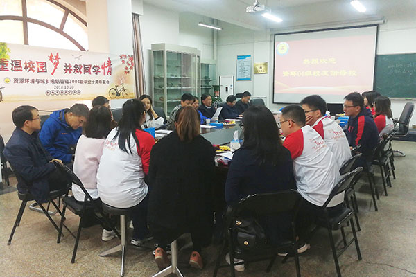 本网讯 四载同窗凝世情,十年游子聚民生。阔别母校十年,2004级资源环境与城乡规划管理专业校友再次相聚母校。2018年10月20日,地测学院召开资环04级校友座谈会。地测学院院长唐跃刚,党委副书记杨向东,学工办主任徐春光,能地系教师马施民、方家虎,地物系教师朱国维、郝多虎,地环系教师胡社荣、董东林、杨柳,资环04级辅导员张庆国,以及14名校友出席座谈会。座谈会由资环04级班长赵野主持。