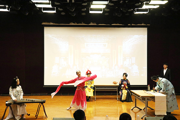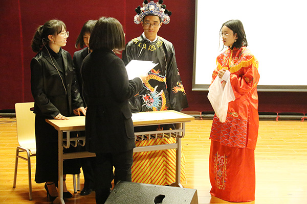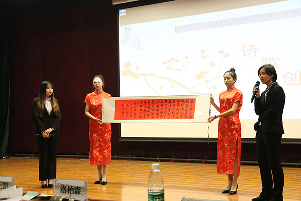 比赛伊始,由刘欣然、蓝添慧带来的陶笛伴舞《女儿情》让观众大饱眼福和耳福,“嬿婉回风态若飞,丽华翘袖玉为姿”,蓝添慧身姿轻盈,舞步曼妙,配合着刘欣然袅袅的笛音,引得全场惊艳,观众席上热烈的掌声把现场气氛带动起来。正式比赛环节共四轮,知识问答、风险抢分、诗歌鉴赏、人文演绎。第一环节知识问答中分为必答题和抢答题两部分。6支队伍的选手们全身心投入,有人低头沉思,有人胸有成竹,有人反应迅速,有人镇定自若,你追我赶的竞争悄然展开。第二环节风险抢分,分值越高的题难度越大,答对一题获得相应的分数,答错则扣除本环节所有得分并结束答题。两轮紧张的答题环节结束,丁晨辰同学带来了一首优美的《彝族舞曲》,缓和了紧张的气氛。第三环节由评委提前命题,各队选一至两名队员向评委讲解,评委现场点评打分。选手们充分挥洒自己的才华,创作出对仗工整的诗歌,用词讲究,每一首都有其独特的意境和志趣,评委也给出了中肯的评价。第四环节人文演绎,这一环节在比赛前拟定主题,由各队现场演绎。有的队伍用表演让我们发笑:霸王别姬的重新诠释,博物馆奇妙夜的神奇脑洞。有的队伍用表演向我们发问:我国古董流落他乡何去何从?中国艺术与时代是冲突还是融合?有的队伍用表演带我们重探:画家郎世宁中西结合的智慧,北宋街景风貌的热闹繁华……虽然来自不同院系、不同年级,却因为共同的文化底蕴和对文学的热爱走在了一起,凭借着彼此的默契在比赛中大展风采。
