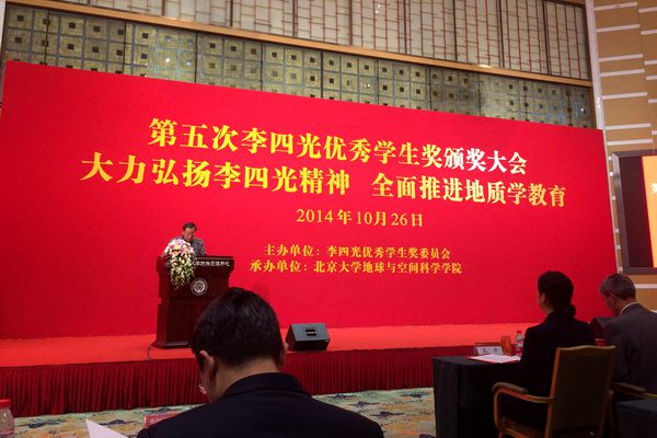 10月26日下午,第五次李四光优秀学生奖颁奖大会在北京大学举行。国土资源部副部长汪民、中国科学院院士李廷栋、教育部科技司副司长雷朝滋,中国石油大学(北京)校长、李四光优秀学生奖委员会委员张来斌,北京大学党委副书记叶静漪等嘉宾以及师生代表出席颁奖大会。地测学院教师程宏飞、辅导员马自强及本科生代表70余人参加了大会。