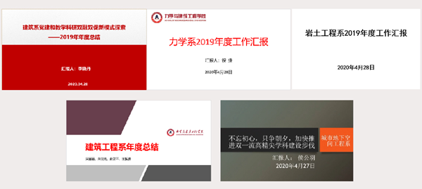 随后,学院各系负责人进行工作汇报。岩土与矿建工程系主任李清、城市地下空间工程系副主任侯公羽、工程力学系主任祝捷、建筑工程系副主任朱红光、建筑学系主任李晓丹,分别从教学、科研、党建、学科建设和学科竞赛等方面,对2019年各系工作进行了全面梳理总结,对2020年重点工作进行了规划。
