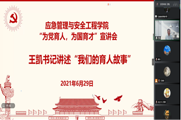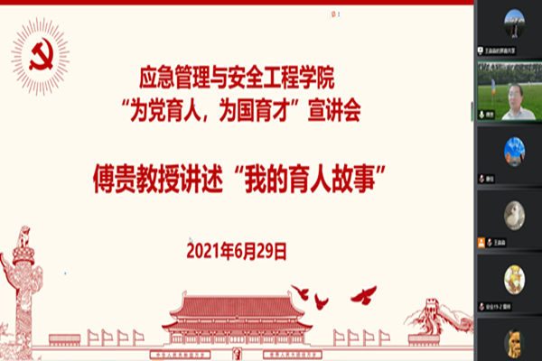 本网讯 为贯彻落实习近平总书记在清华大学考察时的重要讲话精神,6月29日,应急管理与安全工程学院线上举办“为党育人,为国育才”宣讲会,院党委书记王凯与傅贵教授分别讲述“我们的育人故事”和“我的育人故事”,全院400余名师生参会。