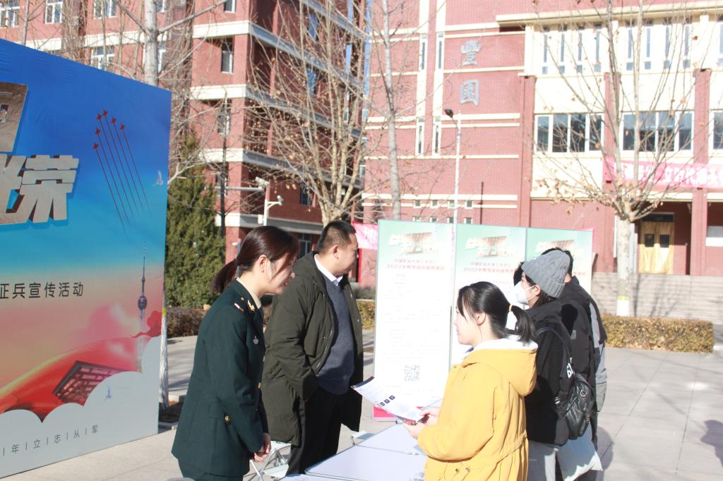 本网讯 为做好2022年春季征兵工作,武装部于12月7日和8日分别在沙河校区、学院路校区举办了校园征兵宣传咨询、征兵政策宣讲、参军报名学生见面会等系列活动。党委武装部部长安宇、副部长童军武以及各学院的500余名学生参加此次活动。