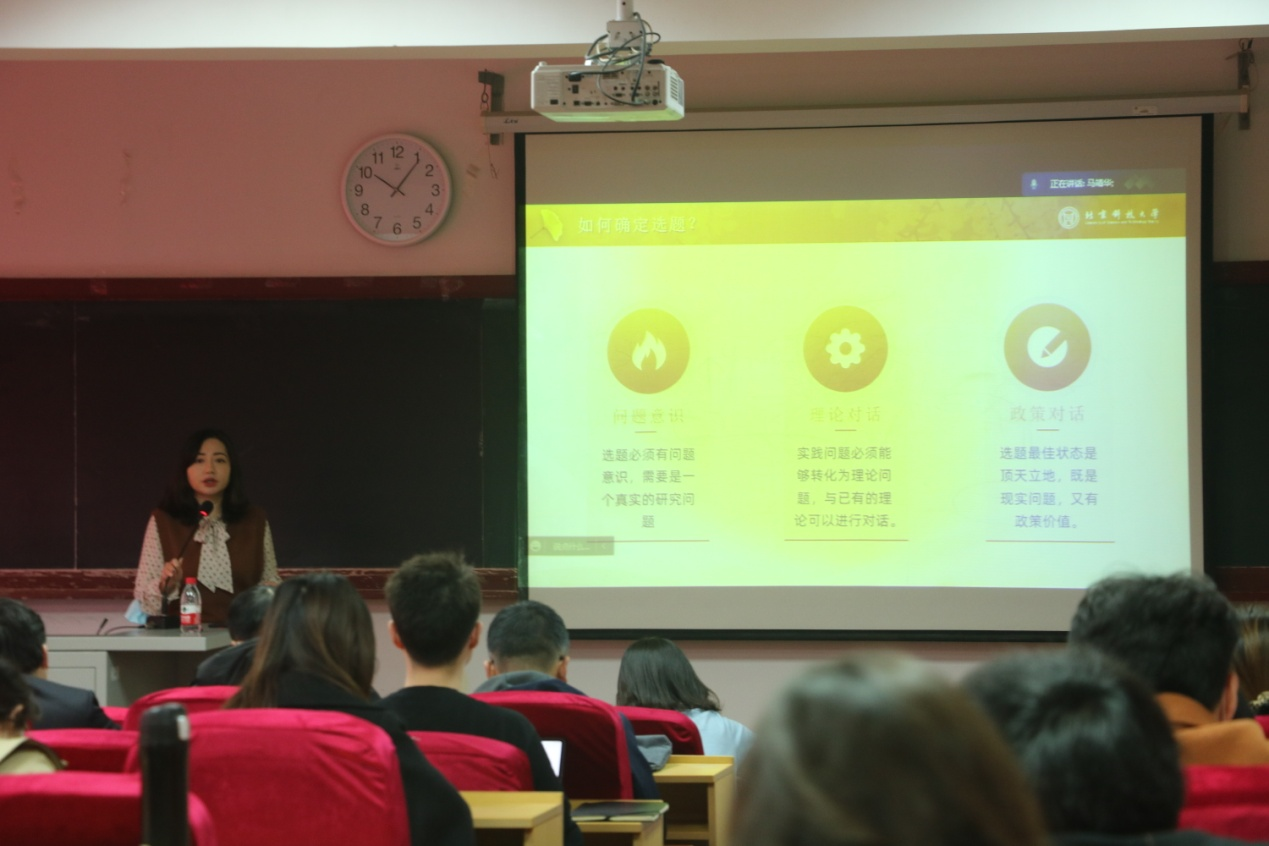 王杨根据辅导员工作的特点,结合自身申报教育部高校思想政治理论课教师研究专项的经验,以“文科纵向课题申报的一些思考——以教育部高校思想政治理论课教师研究专项申报为例”为题,从确定选题、文献综述、搭建内容框架和突出创新性四个方面进行了精彩讲授。关于选题,强调选题要有问题意识,要有理论对话和政策价值,而研究问题须注重具体而集中、可以进行科学分析和专注一个集中研究;对于文献综述,强调要注重综合、重述和评析;对于搭建内容框架,重点从研究思路、研究内容、研究方法和技术路线四方面进行讲解;对于创新性,强调理论创新、思想创新和方法创新三个方面进行思考和研究。