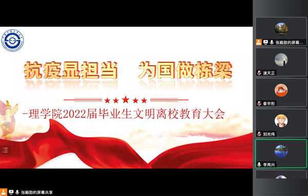 6月8日下午15:30,理学院在线上召开2022届毕业党员教育大会,学院党委书记张蕊参加会议并讲话。学院全体毕业生党员参加会议,会议由学院党委组织员、毕业班辅导员张殿勋主持。