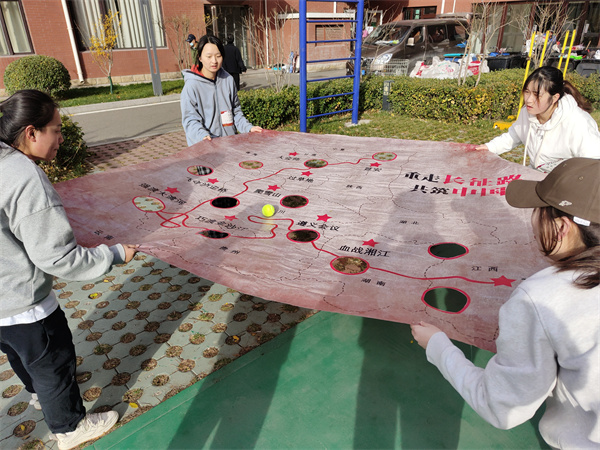 此次活动将红色元素与体育运动相结合,将党的二十大报告内容融入到定向越野活动中,传承红色基因,以此引导广大青年听党话、跟党走,成长为有理想、敢担当、能吃苦、肯奋斗的新时代好青年。在个人组比赛中,将党的二十大报告100题融入比赛环节,参赛学生通过扫码回答党的二十大报告有关题目,答对后获得下一个点位信息,直至最后到达终点,引导同学们进一步学习党的二十大报告,将党的二十大精神铭记在心中,贯彻在生活中,启航新征程。团体赛需四人为一小组进行比赛。团体组除了按顺序打点外,还需在各个自由点齐心协力完成游戏任务,任务中包含着党的二十大报告100题问答。团队成员需在赛前学习党的二十大报告,并在任务点中运用学习知识,以完成任务。这种赛前学习、赛中运用的方式,有助于参赛学生深刻领悟党的二十大报告。游戏点包括摸石过河、重走长征路,齐心协力、最强记忆,将体能、协调性和团队协作能力相结合,融入红色文化,红色精神,社会主义核心价值观以及党的二十大精神,以小活动的形式引导团体合作,共同学习党的二十大精神。答题点需回答五道有关党的二十大报告的知识题目,题目从题库中随机抽取。团队需共同作答,共同学习党的二十大精神。