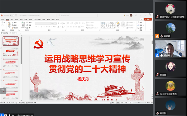 本网讯 11月22日下午,管理学院通过腾讯网络会议召开学习宣传贯彻党的二十大精神宣讲部署会,学院党委书记杨庆舟以《运用战略思维学习宣传党的二十大精神》为题,进行了党的二十大精神宣讲,对学院学习宣传党的二十大精神进行了动员部署。学院全体教师以及学生党员参加会议。