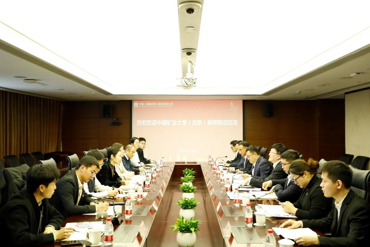 关锋对李帅一行到访表示热烈欢迎。他详细介绍了一局三公司党建工作模式、“三核两驱”业务结构、市场布局等情况。他表示矿大(北京)近年来向公司输送了大量的优秀人才,为公司的发展做出了重要贡献,希望校企双方坚持深入合作,携手并进,未来在新基建、智能建造、绿色建筑等方面开展深入合作。